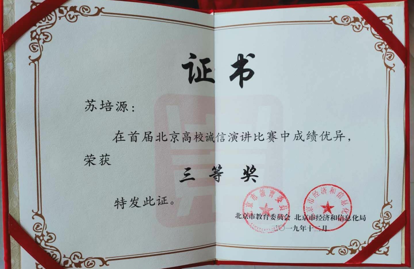 2019年12月22日-28日,以“誠信我踐行·風采耀京城”為主題的“首屆北京高校誠信演講比賽”在京舉行,來自我院生命文化學院1901殡葬班蘇培源同學(演講題目:“堅守誠信,把握自己”,指導教師:張洪來)最終獲得三等獎。