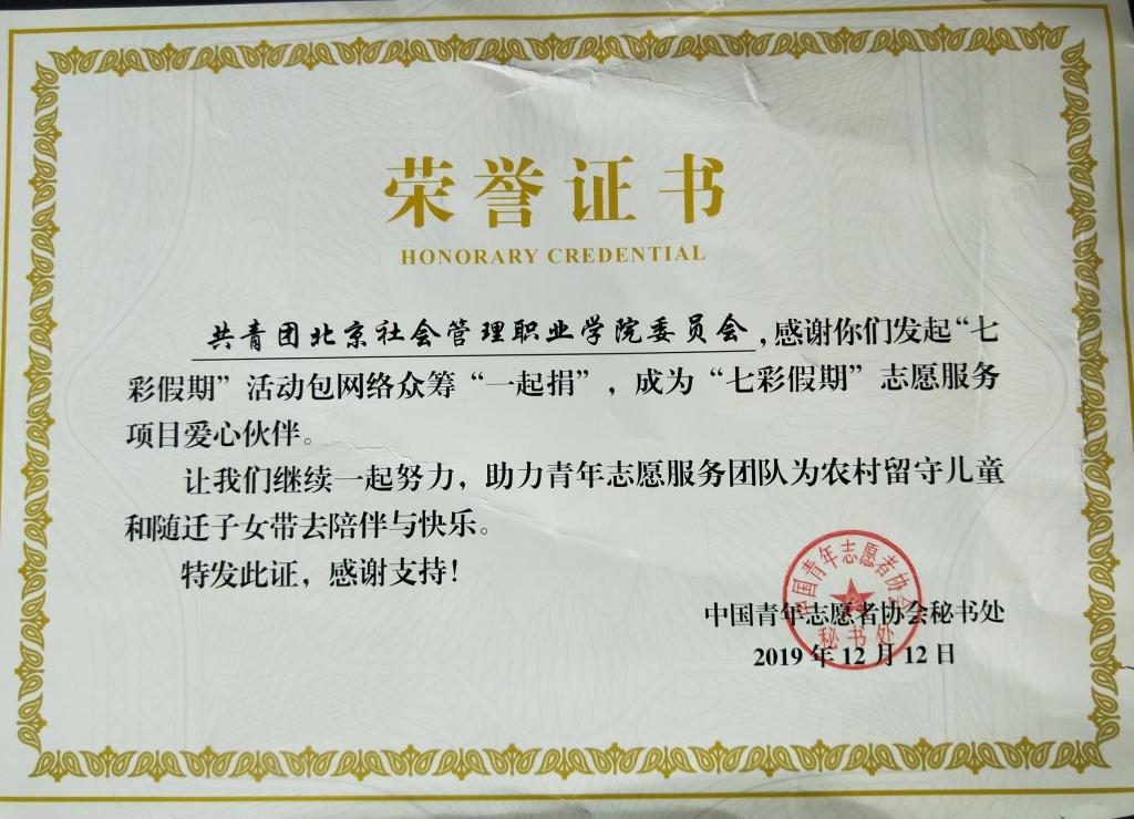 日前,我院團委收到中國青年志願者協會秘書處寄來的《榮譽證書》。表揚院團委發起“七彩假期”活動包網絡衆籌“一起捐”,成為“七彩假期”志願服務項目愛心夥伴。鼓勵繼續一起努力,助力青年志願服務隊為農村留守兒童和随遷子女帶去陪伴與快樂。