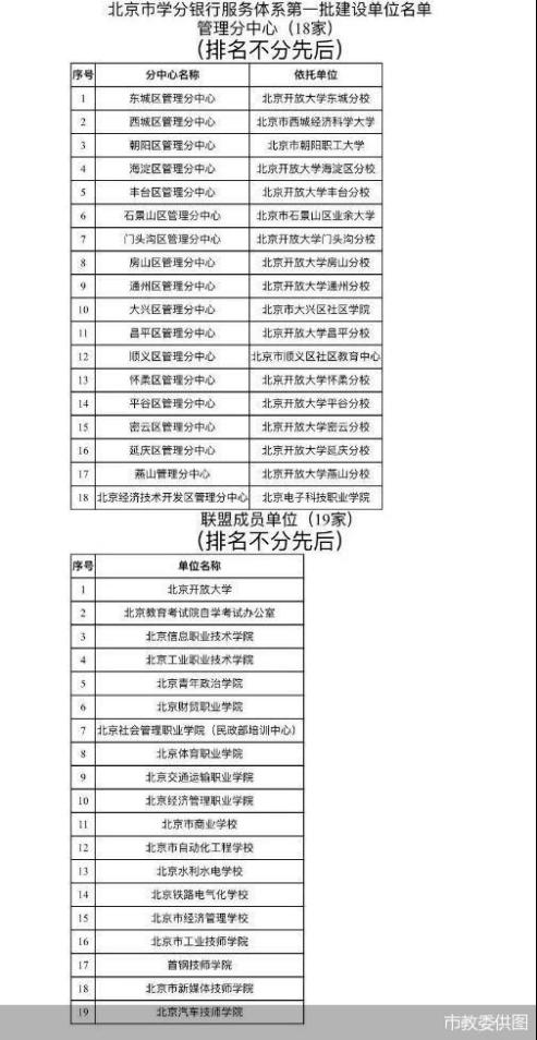 其中,北京市學分銀行管理中心設在北京開放大學,負責學分銀行的建設、運行和管理等日常工作;學分銀行管理分中心依托各區開放大學分校設立,負責區域内學分銀行的運行和管理工作;學分銀行聯盟成員單位由高等學校、中等職業學校、成人院校、行業企業等單位組成,共同倡導資源共享、課程互選、學分互認,主要負責為本單位學習者辦理業務。